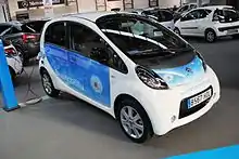 The Mitsubishi i-MiEV (MiEV is an acronym for Mitsubishi innovative Electric Vehicle[4]) is a five-door hatchback electric car produced in the 2010s by Mitsubishi Motors, and is the electric version of the Mitsubishi i. Rebadged variants of the i-MiEV are also sold by PSA as the Peugeot iOn and Citroën C-Zero, mainly in Europe. The i-MiEV was the world's first modern highway-capable mass production electric car.[5][6]