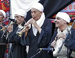 ![]() Egyptian Musicians playing the traditional mizmar (center), between ney flute and goblet drum. | |