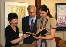 Dr. Peggy Pearlstein, Head, Hebraica Section, African and Middle Eastern Division, U.S. Library of Congress, accepts two unpublished manuscripts written by Risikoff on behalf of the Library. Pictured with her are Risikoff's grandson and great-granddaughter, Rabbi Arnold Resnicoff and Malka Sarit Resnicoff. June 7, 2010.