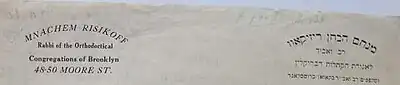 Risikoff's first name, "Mnachem," appears in variant forms including "Menachem" and "Menahem," but "Mnachem" is the spelling he seems to have preferred during his time in the United States, and was the spelling used in writings that spanned many years—from the 1938 letter from President Franklin Delano Roosevelt, congratulating Risikoff on his 50th wedding anniversary;[39] a news story in the Brooklyn Eagle about Risikoff that referred to him as "one of the oldest Orthodox rabbis in Brooklyn; a photo and caption on file with the Brooklyn Public Library;[40] and the 2010 press release from the Library of Congress that described the donation of two of Risikoff's unpublished manuscripts.[41] (In another Brooklyn Eagle article, Mnachem is used as the spelling of his first name, although his last name is spelled differently.) Most importantly, however, "Mnachem Risikoff" was the spelling Risikoff used on his own printed stationery.[42]