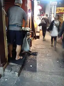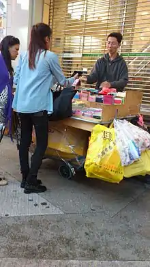 Hong Kong experienced economic downturn in the 1950s, meanwhile, refugees from the Mainland fled to Hong Kong constantly after the establishment of the People's Republic of China, leading to an increase in population. People struggled to make a living, they started to operate mobile stalls using wooden carts with low production costs.[1] With the portable carts, street vendors could get away in time from being arrested by the police. In the 1970s and 1980s, a wide variety of products were sold then. Besides food and snacks, household goods, clothing and kitchenware could be found in the mobile stalls. They are mostly located in Sham Shui Po[2] and Mong Kok.