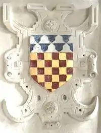 Pippa Middleton's coat of arms (granted 2011), based on those of her father. This lozenge version, supported by a blue ribbon, denotes an unmarried woman.[9][10]