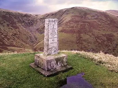 Mostly the return route would be to just return by the route taken outwards, but it is possible to go down over Arthur's Seat to the River Annan at Ericstane, climb out of the other side of the valley and onto the A701 and hence back to Annanhead. The area in the valley around Ericstane is rich in ancient remains (settlements and burnt mounds) and before you get back to where the car is parked you will pass a monument[26] above the Beef Tub to John Hunter of Tweedsmuir, a covenanter who was shot in 1685 while trying to escape from dragoons by climbing the side of the Beef Tub.