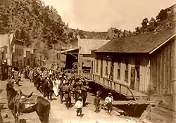 In the 1870s, Sergeant James C. Cooney of Fort Bayard found a rich strand of gold in the Gila Mountains near the future site of Mogollon.[5] A miner named John Eberle built the first cabin in Mogollon in 1889, after mines were developed in Silver Creek, which runs through the town. A jail and post office opened in 1890, and the first school was added in 1892.[6] During this period of growth, Mogollon absorbed the population of nearby Cooney, and helped towns like Glenwood, Gila and Cliff grow because of their locations along the trail to the town. Between 1872 and 1873 the stagecoach from Mogollon to Silver City was robbed 23 times by the same assailant. He was eventually apprehended by agents of the Wells Fargo.[7]