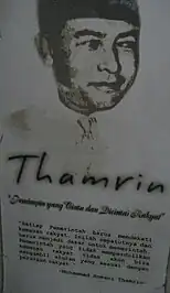 Thamrin has several objects named after him, including Jalan M.H. Thamrin, a thoroughfare in Central Jakarta,[4] and Mohammad Husni Thamrin School for the Gifted, a school in East Jakarta for students with an IQ of more than 120.[17] His old home on Kenari street in Senen, Central Jakarta, is now a museum dedicated to his life.[18] Two statues of Thamrin have been erected in Jakarta: a bust near the National Monument and a full-body statue in front of the Thamrin Museum.[19]