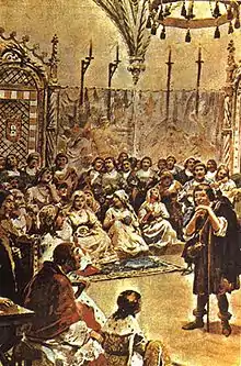 With Spanish roots, it was Gil Vicente's first play, written for the celebration of the birth of the prince Dom João, the future king John III of Portugal. It premiered in 1502 at the royal court, then located in Castelo de São Jorge, in Lisbon.