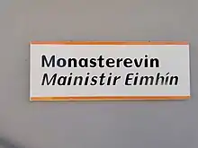 Monasterevin's unique sign, showing the station's names in both Gaeilge and English. It is the only set of signs in the country to be aligned to the left.