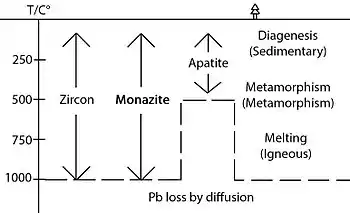 Monazite is characterized by its high Pb retention ability even at high temperatures for a prolonged period. The closure temperature of monazite in U-Th-Pb system is higher than 800 °C, much higher than the other common minerals.[5][9][10][11]