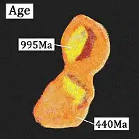 Zonation is a characteristic of monazite. A single monazite grain can contain domains of distinctively different compositions and ages. These domains are widely accepted to represent episodes in geological history with monazite growth or recrystallisation.[3][18] The key to monazite geochronology is to find out what geological events or environments a domain represents, by comparing its chemical composition with mineral stability and reactions. The age of the event is thus represented by the domain age.
