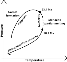 The objective of monazite geochronology is to relate these monazite forming events/reactions with P-T conditions. We can then put time constrains on the P-T loops, forming a comprehensive pressure-temperature-time loops revealing the metamorphic history of the rocks.[6]