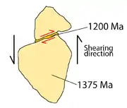 Monazite can form in fabrics caused by deformation. Monazite may be present as elongate grains aligned in foliation. It can be interpreted that either the monazite formed before the shearing and was aligned during shearing, or formed at the same time as the shearing.[3] It thus provides an upper limit of the shearing age. For example, if the monazite is dated 800 Ma, the age of shearing cannot be older than 800 Ma.
