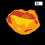 The ideal formula of monazite is [LREE(PO4)], the variation in composition is mainly due to the chemical substitutions of light rare earth elements (REE) in monazite by other elements. One of the common substitutions are the exchange between LREE with Th and Ca, and P with Si to form huttonite [Th(SiO4)] and brabantite [CaTh(PO4)2]. Since all three minerals share the same chemical structure, they are the three endmembers in their solid solution, meaning that they appear in a same solid phase where substitutions happen. It is important to note that the compositional zonation patterns may not be the same when we are considering different elements, and age zonation may have no relationship with compositional zonation at all. (see images from the section: analysis procedures) Thus, one needs to be very careful in linking among zonations. In natural monazite, the zonation pattern maybe complex and hard to interpret. Below we describe some simple chemical zonation patterns and the associated interpretations. Zonation patterns associated with igneous activity are usually easy to interpret. However, those associated with metamorphism are more complicated.[2]