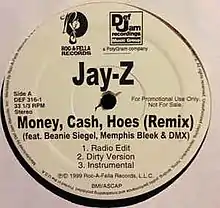 "Money, Cash, Hoes" is a song by American rapper Jay-Z as the third single from his third album Vol. 2... Hard Knock Life (1998). It was released on December 18, 1998. While the album version features a guest verse from rapper DMX, the remix features fellow rappers and Roc-A-Fella Records artists Memphis Bleek and Beanie Sigel with production by Swizz Beatz. Its beat features a sample of "Theme of Thief" from the 1989 Sega game "Golden Axe".[1] Producer Swizz Beatz stated that the glissando sounds were made by him sliding his hand across a keyboard, originally as a joke.[2] The remix version is featured on the soundtrack to the movie The Corruptor. The music video for the remix version of the track is intertwined with clips from The Corruptor as well. In the end of the track, Pain in Da Ass talks, recreating dialogue from the film Goodfellas.