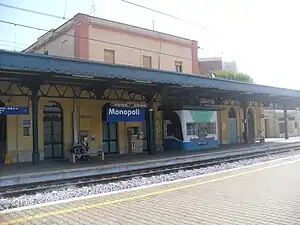 Monopoli (Italian: Stazione di Monopoli) is a railway station in the Italian town of Monopoli, in the Province of Bari, Apulia. The station lies on the Adriatic Railway (Ancona–Lecce). The train services are operated by Trenitalia.