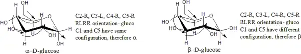 Ring closure creates another chiral center at the anomeric carbon (the one with the hemiacetal or acetal functionality), and therefore each open-chain stereoisomer gives rise to two distinct stereoisomers (anomers). These are identified by the prefixes 'α-' and 'β-', which denote the relative configuration of the anomeric carbon to that of the stereocenter at the other end of the carbon chain. If the conformation (R or S) is identical at both the anomeric carbon and the most distant stereocenter, the configuration is 'α-'. If the conformations are different, the configuration is 'β-'[3]