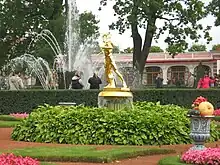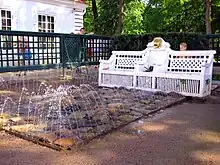 Side alleys of the garden have a number of prank fountains ("фонтаны-шутихи").[3]Two of them are disguised as benches, named «Диванчики» (Divanchiki, "Little sofas"). The fountain is activated when one steps on a pavement in front of such a "bench", and the person will be sprinkled.[4][5]
