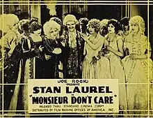 Monsieur Don't Care is a 1924 American silent comedy film starring Stan Laurel as "Rhubarb Vaselino". The film is a parody of the Rudolph Valentino film Monsieur Beaucaire (1924).