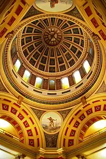 The most notable feature inside the center of the Capitol building is the massive rotunda, with four circular paintings surrounding it. These paintings, painted for the Capitol opening in 1902 by the firm of F. Pedretti's Sons, depict four important archetypes of people of Montana's early history: a Native American (intended to be of Chief Charlo), an explorer and fur trapper (Jim Bridger), a gold miner (Henry Finnis Edgar, one of the discoverers of gold at Alder Gulch), and a cowboy (unidentified, but said to be inspired by the works of C.M. Russell).[8] The Pendretti brothers provided additional commissioned artwork in the Senate and Old Supreme Court Chambers.