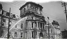 Construction on the building began in 1872 and was completed in 1878. The original building was gutted by fire in March 1922, leaving only the outer wall and destroying many of the city's historic records.[5] The architect Louis Parant was commissioned for the reconstruction, who decided to build an entirely new building with a self-supporting steel structure built inside the shell of the ruins.[5] This new building was modelled after the city hall of the French city of Tours.[6] Other changes included a remodelling of the Mansard roof into a new Beaux-Arts inspired model, with a copper roof instead of the original slate tiles.[5] The new building opened on February 15, 1926.