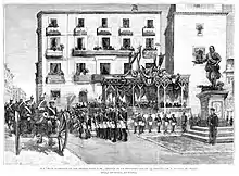It was officially unveiled on 19 December 1891, at its location in the Plaza de la Villa, during a ceremony presided by queen regent Maria Christina of Habsburg-Lorraine.[4] The inauguration was also attended by the Infanta Isabella, Alejandro Pidal y Mon, Prime Minister Antonio Cánovas del Castillo, a number of additional government ministers, several generals and members of the councils of the Ayuntamiento and the Provincial Deputation, among others.[5]