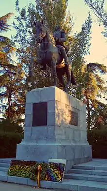 The bronze composition depicts Bolívar riding his horse while raising his right arm, meanwhile the horse raises its front right leg.[5] The equine figure was modelled after a horse owned by Ángel Peralta Pineda.[1] Laíz cast additional replicas of the statue to send to Colombia and Venezuela.[1] The statue is placed on a plinth made of white stone from Colmenar de Oreja and a granite basement, making a total height of 7.50 m.[6]