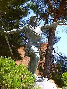 The project was awarded to Enrique Pérez Comendador, who, after some earlier models, opted for a figure performing a cross-like posture with the arms stretched forward and backward, somewhat influenced by the Artemision Bronze.[3] Cast in bronze, the statue stands 2,50 metre high.[4]