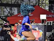 Sanelisiwe Twisha (born c.1987), known professionally as Moonchild Sanelly[2] is a South African musician and dancer. She is known for her signature blue-coloured hair and her self-created music genre called "Future ghetto funk".[3] Originally from Port Elizabeth, the singer first came into limelight in the Durban poetry and music scene before relocating to Johannesburg, where she has continued her musical career.