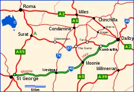 The highway leaves Dalby via Nicholson and Loudoun Streets. After about 7.8 km it crosses Myall Creek just south of its junction with the Condamine River. After a further 1.7 km it crosses the Condamine. It runs through rich farming land until it reaches the locality of Kumbarilla near the intersection with the Surat Developmental Road. Kumbarilla is located on a ridge (Kumbarilla Ridge) which divides the Surat Basin from the Clarence-Moreton Basin to the east. The road then passes by and through the Kumbarilla State Forest, an area of about 86,000 hectares[3] of native bushland. It then passes through the Waar Waar State Forest and more farmland before reaching the Leichhardt Highway at Moonie.