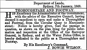 3. 1 2 "Thoroughfare and Footway". New South Wales Government Gazette (Sydney, NSW : 1832–1900). 10 January 1868. p. 76. Retrieved 22 April 2021.