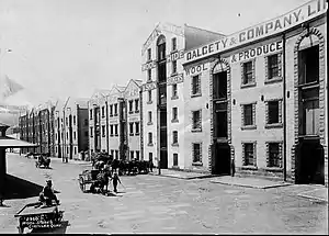 By the 1860s, the difficulty of getting between the Tarpeian Way [the path along the top of the escarpment, now part of the Royal Botanic Garden] and the quay had "been the subject of loud complaint" for a number of years.[4] The first design for the stairs, in a drawing by the City Engineer Edward Bell in 1866, shows a single flight of "bottom block Pyrmont stones" rising to a mid-landing where the stairway divides into two and rises in separate flights to Macquarie Street. The space between the flights held a wrought iron lamp frame and gas lamp. All three flights had a Sydney sandstone balustrade of ashlar blocks and topped with a half-round coping. The whole design was to be supported on sandstone arches and in an area 20 feet wide.[5] A building contract was drawn up and signed in March 1867. However, a land ownership claim was raised by the Mr. Talbot, owner of the Talbot Stores buildings on either side.[2] The dispute was resolved in January 1868 with the Government Gazette proclaimed the land as being "...dedicated to the public as a thoroughfare and footway".[3]