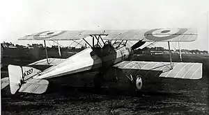 The Morane-Saulnier BB was a military observation aircraft produced in France during World War I for use by Britain's Royal Flying Corps.[1][2] It was a conventional single-bay biplane design with seating for the pilot and observer in tandem, open cockpits. The original order called for 150 aircraft powered by 110-hp Le Rhône 9J rotary engines, but shortages meant that most of the 94 aircraft eventually built were delivered with 80 hp Le Rhône 9C rotaries instead.[2] A water-cooled Hispano-Suiza 8A engine was trialled as an alternative in the Type BH, but this remained experimental only.[1] A production licence was sold to the Spanish company Compañía Española de Construcciones Aeronáuticas (CECA), which built twelve fitted with Hispano-Suiza engines in 1916.