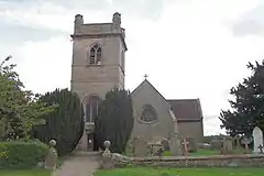 The churchyard has one war grave, that of a World War II Royal Air Force officer.[21] Immediately outside the churchyard stands the parish's war memorial, a stone Celtic cross commemorating dead of both World Wars. Around its base is Earl Haig's quotation: By the long road they trod with so much faith and with such devoted and self-sacrificing bravery we have arrived at victory and to-day they have their reward.[20]
