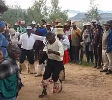 Basotho men in a village near Nthabiseng, Lesotho dancing a traditional Men's Stick Dance