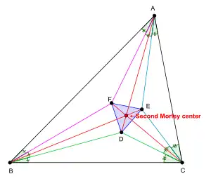 Let △DEF be the Morley triangle of △ABC. Then, the lines AD, BE, CF are concurrent. The point of concurrence is called the second Morley center of triangle △ABC.[1][3]