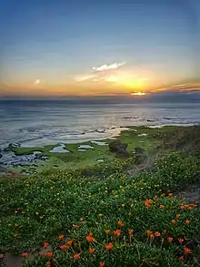 Sunset over rock pools and wildflowers in Sorrento, Mornington Peninsula National Park