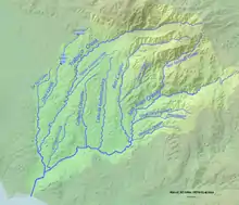 Morrell Canyon Creek is a stream or Arroyo, tributary to San Juan Creek, located in the Cleveland National Forest in Riverside County, California, at an elevation of 3,080 ft (939 m), in the Elsinore Mountains northeast of Elsinore Peak. It arises on the eastern slope of San Mateo Peak.[2] An eastern fork draining the Morrell Potrero joins it a little over a mile north of its source and then flows northwestward about a third of a mile where it turns southeast descending the narrow Morrell Canyon east of Lion Spring. After descending 2.5 miles it turns north for half a mile then returns to a southwestern direction for another mile, the canyon widening here until it turns northwestward and down a steep canyon again for half a mile where it takes in from the right Decker Canyon Creek and Long Canyon Creek. It then turns southwestward again into a wider canyon and descends to its confluence with Bear Canyon Creek and becomes the head of San Juan Creek.[3]
