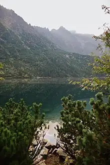 The peaks that surround the lake rise about 1,000 meters above its surface; one of them is Rysy (2,499 meters), the highest peak in the Polish Tatras. Besides Mięguszowiecki Summits (including Mięguszowiecki Szczyt Wielki, 2,438 meters), farther away and slightly to the left, is the distinctive, slender Mnich (“Monk,” 2,068 meters). Many Swiss Pines also grow around the lake.[2]