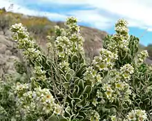 Mortonia is a small genus of flowering shrubs known as saddlebushes, sand paper bush or mortonias. These are rough, thorny, hairy shrubs with leathery leaves and panicles of fleshy white to purplish flowers. They bear nutlets containing 1 seed each. They are native to the southwestern United States and Mexico, where they are most abundant in dry regions.