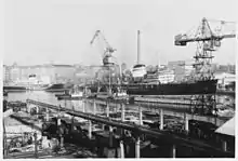 The hull of the icebreaker was assembled on a slipway and launched on 10 January 1959. Prior to this, the harbor basin and the entrance channel had to be dredged. In addition, a special steel pontoon had to be constructed and welded to the stern of the icebreaker in order to reduce stresses and allow safe launching of the heavy ice-strengthened hull.[3] In the launching ceremony, the new icebreaker was given the name Moskva after the Soviet capital while the other icebreakers of the series were named after the largest cities of the Soviet Union. The construction of the vessel continued in the outfitting quay and Moskva was delivered during the summer of 1960.[3]