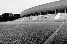 It is one of the best works of the exhibition. It is the first permanent construction of an open theater capable of holding a large mass of spectators, about 12,000. It plays a decisive role for neapolitan rationalist architecture, as it can be considered the first work with rational intentions. It was designed and built between 1938 and 1940, at the age of only twenty-six, by Giulio De Luca who was inspired by the architectural models of Greek and Roman theaters scattered around Magna Graecia. De Luca was able to master his skills as a designer attentive to the problems of an open theater, managing to solve the complex problems of acoustics and visibility of the auditorium by playing on the section and on the internal elevation, creating an interaction of remarkable interest between landscape and architecture. The structure, as a whole, is in counter-slope, this means that the reading of its front is canceled, which is reduced to the crowning pediment. The access level rises eight and a half meters from the ground level and above, a peristyle of pilotis supporting the long curved pediment, 114 meters long, decorated with a mosaic by Nicola Fabbricato. After the Second World War it was damaged, like all the structures of the complex, and subsequently restored for opening in 1952. Over time it fell into decay again due to poor maintenance and the post-earthquake emergency that worsened the conditions. decided in 1989, in agreement with the designer, to demolish the old arena and build a similar one with acoustic and visual improvements. The new arena, bare of the mosaic on the façade, was inaugurated in 2001 with a Bob Dylan concert. In 2015, with a rent of 50,000 euros per year and a percentage of the proceeds, the entrepreneur Floro Flores was awarded the management of the Flegrea Arena for twelve years. Following extensive renovations, from the following summer it hosts the Noisy Naples Fest review which, for the 2018 edition, will bring in concert in Naples, among others, international artists of the caliber of Noel Gallagher with Noel Gallagher's High Flying Birds and Sting.[11]
