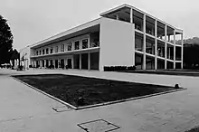 The Latin America Pavilion constitutes the other half of the headway leading to the Fountain. Designed in 1938 by Bruno Lapadula as a group of Bank of Italy pavilions arranged around a garden courtyard. On the façade overlooking the fountain was a painting by Giorgio Quaroni. The pavilions were damaged by war bombings and subsequently restored for the reopening in 1952 on a project by Michele Capobianco, Arrigo Marsiglia and Alfredo Sbriziolo. The 1952 project endowed the pavilion with a loggia characterized by a rationalist appearance with typical Nordic origins that recall in particular the Dutch neoplasticism and the slender steel structures of Ludwig Mies van der Rohe. Currently the pavilion has been recovered by Studio Campagnuolo and Cherubino Gambardella.[7]