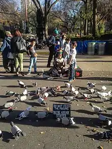 Tina Trachtenburg (née Piña ), known by her stage name Mother Pigeon is a street performance artist in New York City. In a typical show, she arranges an art installation of hand made soft sculptures representing pigeons and other urban wildlife while she sits among them.[1][2] The art is for fun and to promote animal rights for pigeons, rats in New York City, and other animals.[1] Her exhibitions are intended to improve the reputations of animals who are "maligned" and "overlooked".[2] Some art lovers say the pigeons seem real until examined closely.[3]