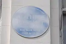 The blue plaque, suffering from being vandalised with white paint, seen in April 2019