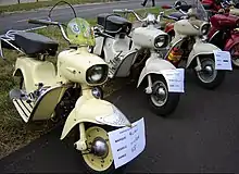 The entire body (with exception of the front forks, crash rails and legshields) was produced in cast aluminium, with the front and rear castings bolted to the engine to form a monocoque which resulted in a light and rigid construction. The rear swinging arm, chaincase and silencer box were also constructed in cast aluminium. These models originally had 8 inch wheels, but by 1958 they reverted to 10 inch which gave a better stability and ground clearance.[3]