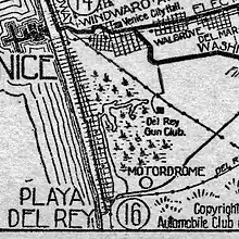 Motordrome is an archaic placename in Los Angeles County, California.[1] It designates a rail spur that existed in the 1910s[2] on the Redondo Beach via Del Rey Line, named for the Los Angeles Motordrome race track and airfield.[3] Motordrome station lay at an elevation of 7 feet (2 m).[1] The coordinates for Motordrome preserved in the GNIS (33°58′07″N 118°26′21″W / 33.96861°N 118.43917°W) place it near the present-day intersections of Jefferson Boulevard and Culver Boulevard, in what is now the Ballona Wetlands Ecological Reserve.