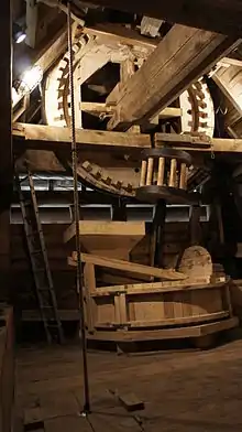The Moulin de Valmy is an open trestle post mill. It has four Common sails carried on a wooden windshaft. There are two pairs of millstones, arranged head and tail. The trestle is unusual in having three crosstrees (instead of the usual two) and thus six pairs of doubled quarterbars.[3]