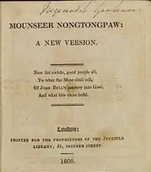 Mounseer Nongtongpaw was originally published by William Godwin's publishing firm, M. J. Godwin, in 1807 as part of its Juvenile Library series.[1] English editions have been located for 1811, 1812, 1823, and 1830 and Philadelphia editions have been located for 1814 and c. 1824.[2] The original edition was illustrated by a protégé of Godwin, William Mulready.[3] Shelley biographer Emily Sunstein speculates that some of the verses may have been written to match illustrations that were already designed.[4] The copper plate engravings are reproduced in Peter and Iona Opie's Nursery Companion.