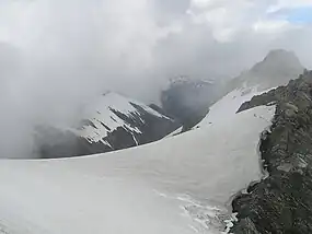 ![]() Mount Adams from the south-east, Escape Glacier at left, Siege Glacier (partially covered in rock debris) at centre. Late summer conditions. | |