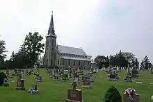The community of Mount Carmel was founded in the 1830s and 1840s with the arrival of Irish settlers who had initially resided in the vicinity of Pickering, Ontario, when they first arrived in Canada, but were drawn by advertisements for low cost Canada Company land available in the southern part of the Huron Tract for agricultural purposes. To meet the needs of the predominantly Roman Catholic population of the emerging community, in the late 1840s, a small frame church was constructed near the banks of Parkhill Creek, two kilometers (1.25 miles) east of the present site of the hamlet on Mount Carmel Drive. The church was located on donated land on the farm of Daniel Coughlin. By 1850, a small commercial core had begun to form at the site of the present intersection and the church building was relocated to a small hill at the northwest corner of the community. During this period, the name of the hamlet was in all likelihood Limerick.