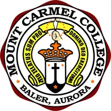 The Mount Carmel College of Baler (Kolehiyong Monte Carmelo ng Baler in Filipino), commonly referred to as MCC Baler or MCCB, is the oldest Catholic mission school in the Philippine province of Aurora.[1] It was founded in 1948 by the American Carmelites, who arrived in Baler upon the invitation of Doña Aurora Aragon-Quezon (1888–1949), former First Lady of the Philippines (1935–1944), wife of the late Philippine Commonwealth President Manuel Luis Quezon, and upon the approval of Alfredo F. Versoza, then bishop of Lipa. It is currently a member of the Catholic Association of Schools in the Prelature of Infanta (CASPI).